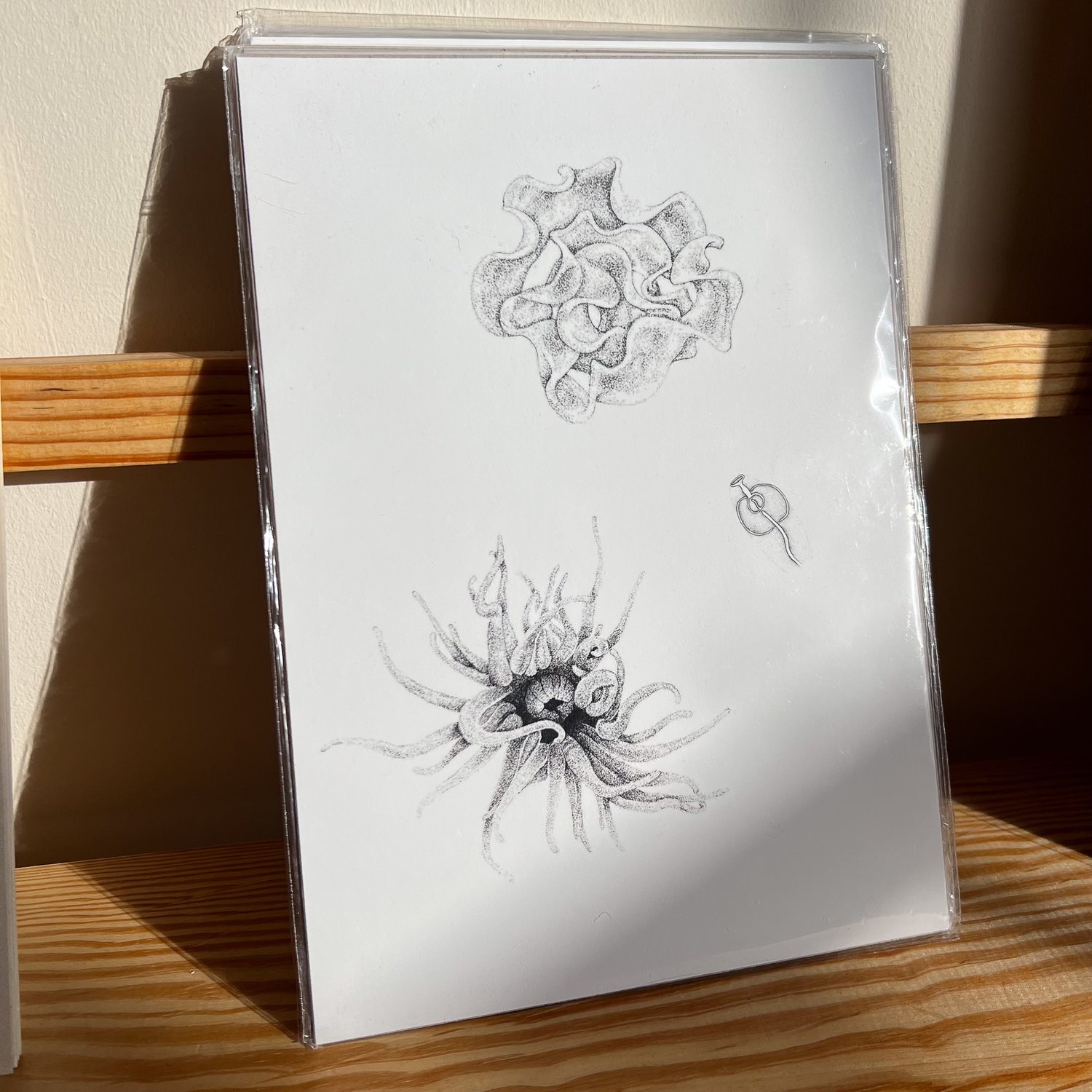 A4 print of pencil illustration of marine creatures encountered while on residency at the Argyll Hope Spot.